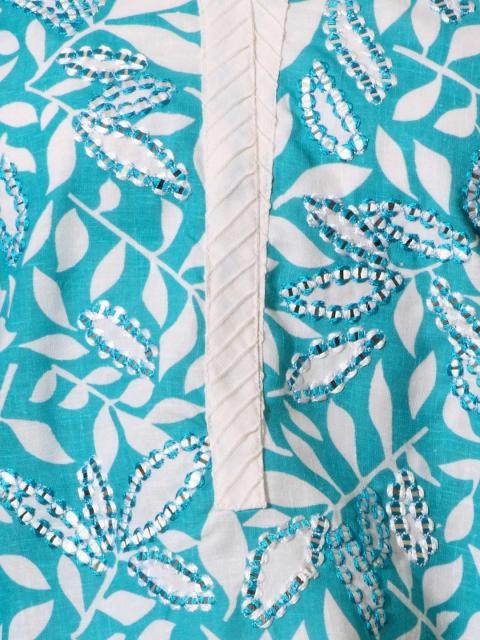 Blue and white printed kurta, has a mandarin collar and a split neckline, has short sleeves and a vented hem