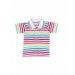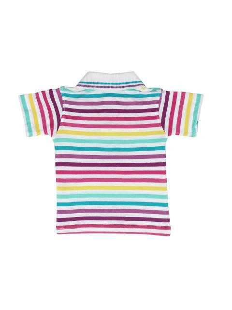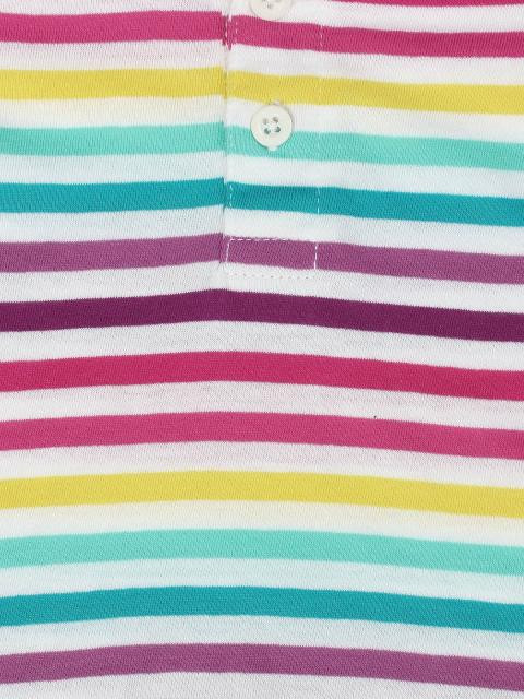 White T-shirt with pink, blue, yellow and purple stripes, has a ribbed and tipped collar with a buttoned chest placket and short sleeves