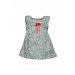 Grey sleeveless dress with floral pattern, made of 100% cotton, with pleats emerging from the sides, red ribbon bow on the front and placket on the back with red buttonsFitting