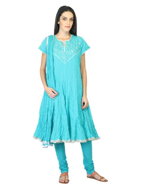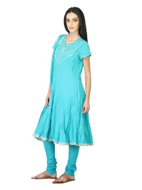 Blue kurta with embroidered detail, has a round neck, beads and sequins on the chest, short sleeves with silver tape detailing on the cuffs and silver lace detailing on the hem