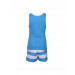 Blue sleeveless round neck t-shirt, has graphic shimmery print on the front and white piping at the neckline