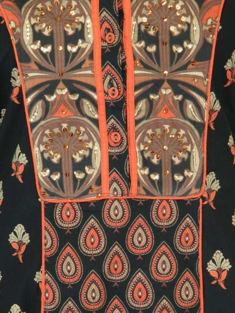 Black printed kurta, has a mandarin collar with a slit neck, mix-and-match printed yoke with orange piping and sequin detailing, buttoned chest placket, three quarter sleeves, and has orange piping along the sleeve cuffs and vented hem