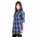 Blue and purple V-neck check shirt made of 100% cotton, has roll over sleeves with mid-arm button, a spread collar, buttoned placket, a belt, embroidered branding above the hem, pin tucks that flare out at the waist and a curved hem