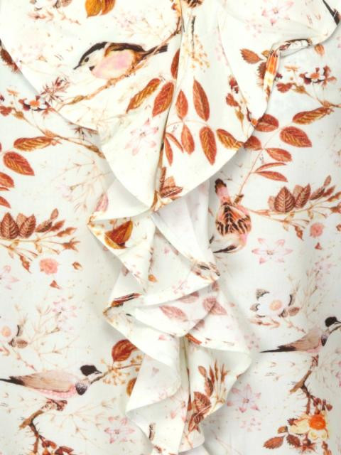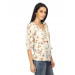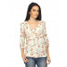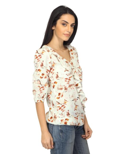 Floral print V-neck top made of 100% viscose, has three quarter sleeves with elasticated cuffs, ruffles on the chest and an elasticated hem