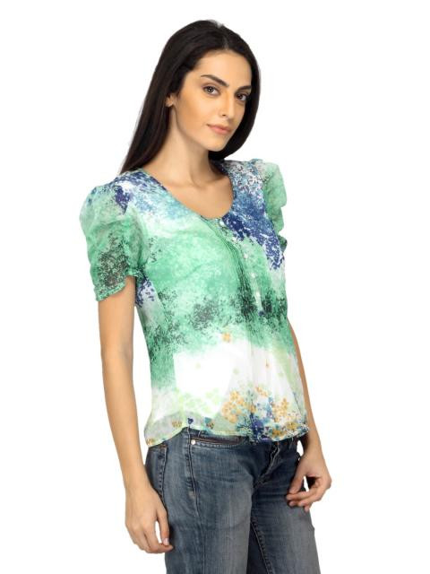 Floral print round neck top made of 100% polyester, has puff sleeves, chest placket, pintucks and stitched detailing on the front