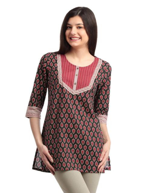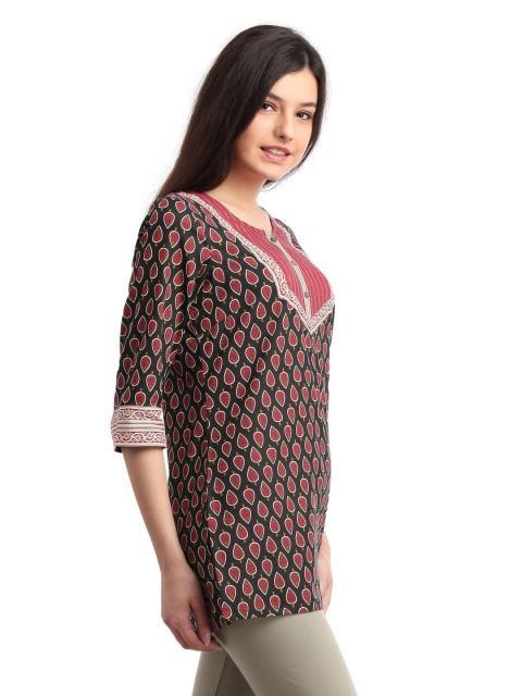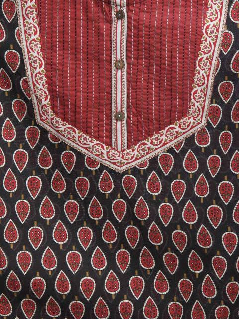 Black kurti, has red print, red paneling on the yoke, round neck and a short buttoned placket, three quarter sleeves and side slits