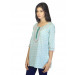 Printed mint green round neck kurti made of 100% cotton, has a half buttoned placket with wooden buttons, three quarter sleeves and a vented hem