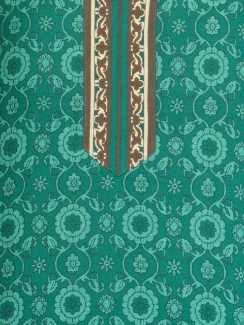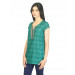 Printed green round neck kurti made of 100% cotton, has a split neckline, cap sleeves and a vented hem