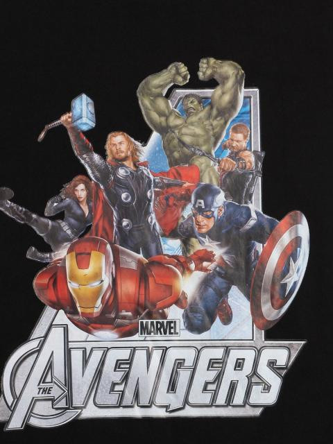 Black T-shirt, has a round ribbed neckline, short sleeves and graphic Avengers print in front