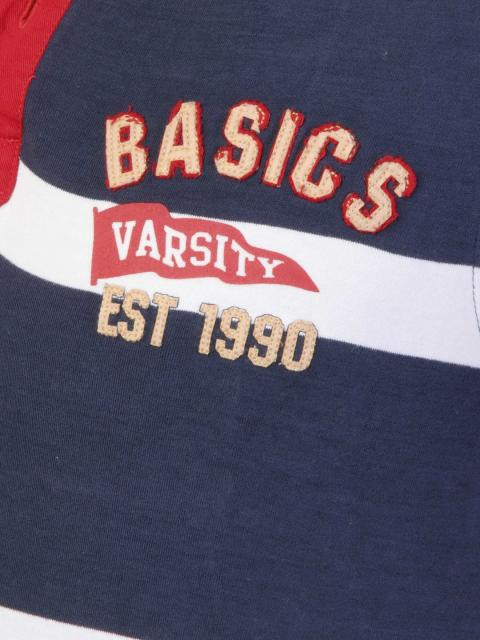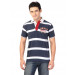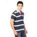 Navy blue and white striped polo T-shirt made of 100% cotton, has a ribbed and tipped collar with a contrast inner, buttoned chest placket in contrast colour, short sleeves with ribbed hems, branding on left sleeve, branding in applique and print on left chest, and a vented hem