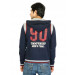 Navy blue jacket made of 100% cotton, has long sleeves with ribbed cuffs that has red and grey stripes, navy and white panel detailing around the armholes, hoodie with drawstring, zippered front placket, patch pockets on either sides of the zipper placket, appliqued helmet and embroidered lettering on the upper left chest, distressed look numbering on the back and ribbed hemline with red and grey stripes