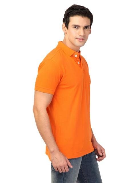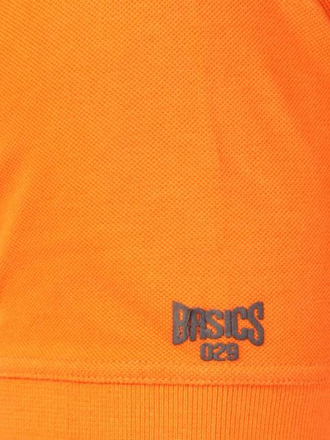 Orange polo T-shirt made of 100% cotton, has a ribbed and tipped collar with a buttoned rugged chest placket, short sleeves with ribbed hems, branding on left sleeve and a vented hem