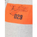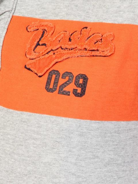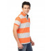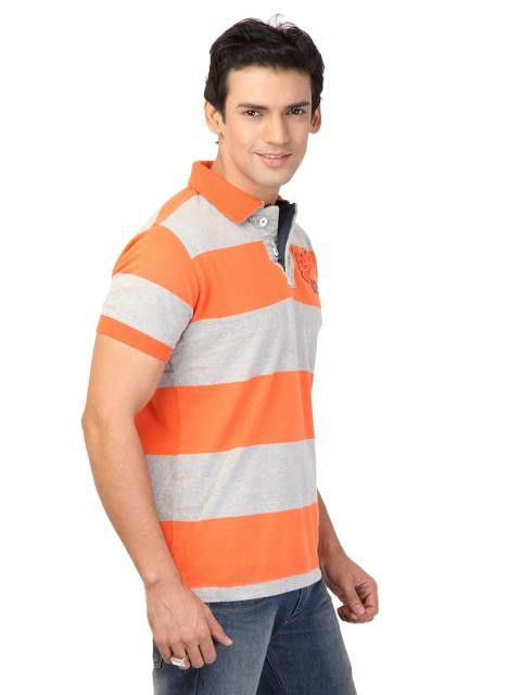 Broad orange and grey stripes T-shirt made of 100% cotton, has a ribbed and tipped collar with a buttoned chest placket, short sleeves with branding on the left one, appliqué d and printed brand badge on left chest and has a vented hem
