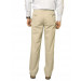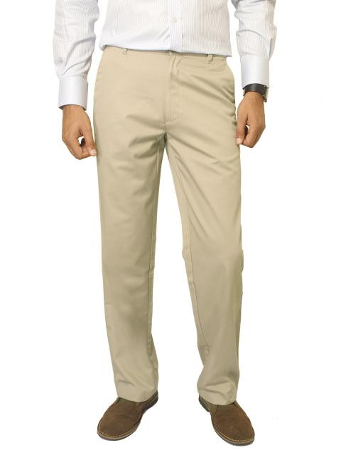Light khakhi brown trousers made of cotton blend fabric, that has flat front with two insert pockets on the sides, two welt pockets on the back with buttoned closures, plastic zipper and button closure, loops on the waist to secure a belt and extended hems that can be trimmed to suit the wearer's height