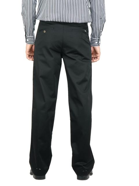 Black trousers made of a cotton blends fabric, has a flat front, two pockets on the sides, two patch pockets on the back with buttoned closures, belt loops at waist, appliqué d brand patch above the right pocket with a button and zipper closure and snipped edges at the hem