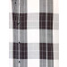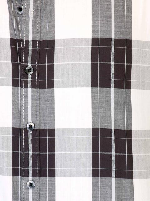 White, grey and black plaid check shirt made of 100% cotton, that has long sleeves with buttoned cuffs, spread collar with tape detailing on the inseam, front buttoned placket and curved hem with godets on the side seam hems