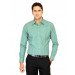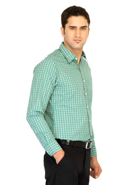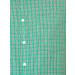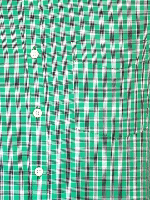 Green, black and white plaid check shirt made of 100% cotton, that has long sleeves with buttoned cuffs, spread collar with tape detailing on the inseam, front buttoned placket, patch pockets on the left chest and curved hem