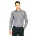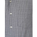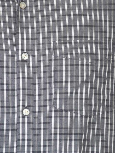 Grey and white check shirt with tiny white patterned weave made of 100% cotton, that has long sleeves with buttoned cuffs, spread collar with tape detailing on the inseam, front buttoned placket, patch pockets on the left chest and curved hem