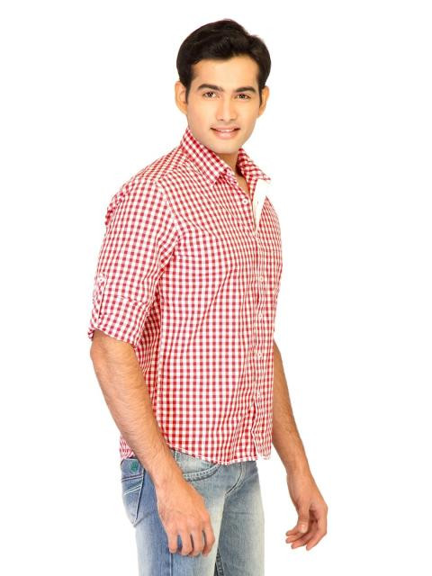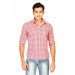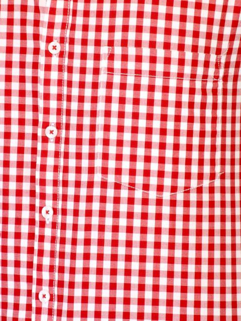 Red and white gingham check shirt made of 100% cotton with a washed effect, that have long sleeves with buttoned cuffs and a button on the elbow level that can be used to roll up and keep the sleeve in place with a flap, spread collar, front buttoned placket, patch pocket on the left chest and curved hem