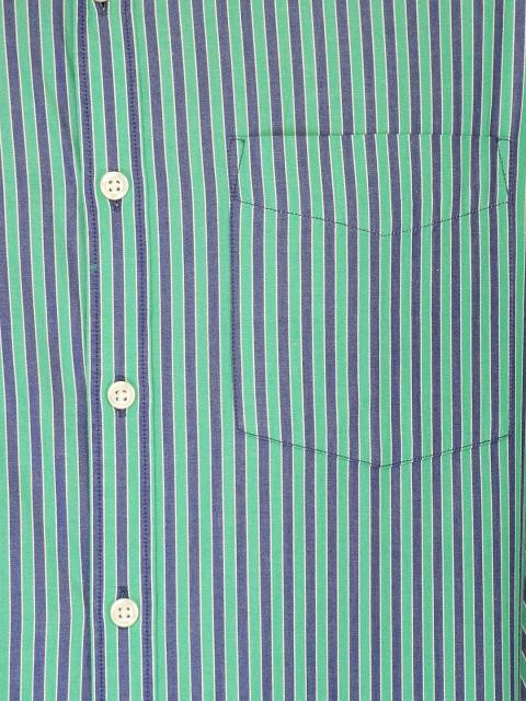 Green and blue striped shirt made of cotton, that has long sleeves with buttoned cuffs, spread collar, front buttoned placket, patch pocket on the upper left chest and curved hem