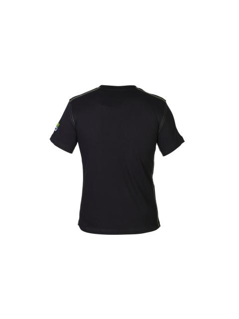 Black and green round neck t-shirt, has short sleeves with branding appliqued on the left sleeve, graphic and rubber print on the front and stitch detailing
