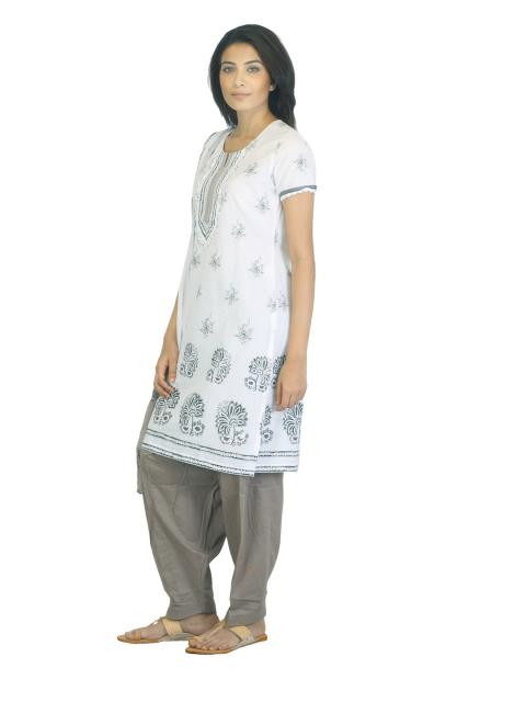 White and grey printed kurta, has a round slit neckline, embroidery, and stitch detailing on the chest, short sleeves with lace detailing on the cuffs and a vented hem