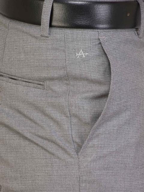 Grey formal  trousers made of 64% polyester, 34% viscose and 2% lycra, has a flat front with two pockets on the sides, two welt pockets on the back with button closures, brand badge at the side of the right pocket, loops on the waist, reinforced stitch detailing along the crotch area, a zipper and button closure