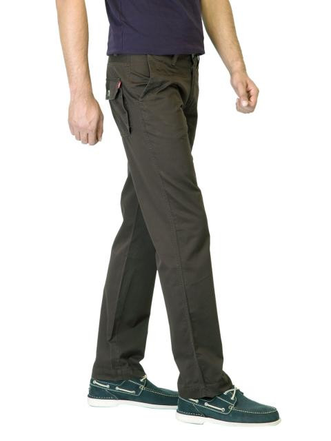 Brown trousers made of 100% cotton, has a flat front, two pockets on the sides, two welt pockets on the back with buttoned closures, one small coin pocket on the right, belt loops on waistband, applique brand tab on the right hip pocket, stitch detailing and a button and zipper closure