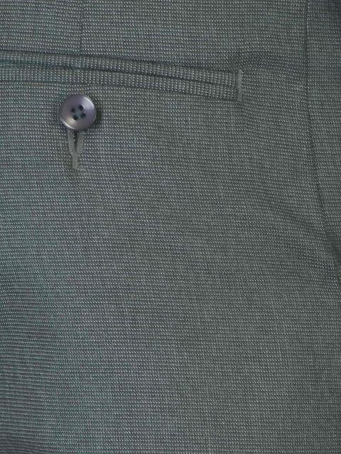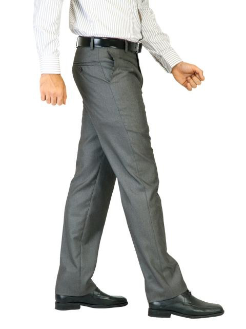 Grey trousers made of polyviscose, has a flat front, two side pockets, two back pockets with button closures, comfortable looped waist, and a zipper and button closure on the front