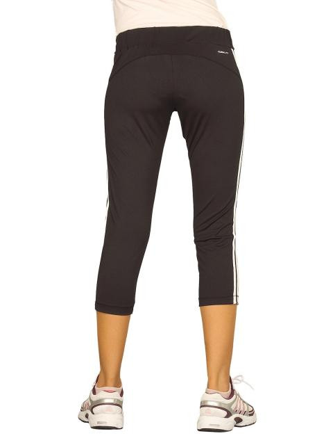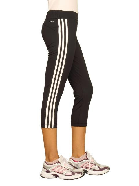 Black capris made of 92% polyester and 8% lycra, has a broad waistband with a firm elastic portion at the back, printed logo on the left and adidas 3-Stripes along the length