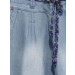 A pair of blue woven mid-rise chambray capris, has a zip fly and button closure, a waistband with belt loops, pleat detail on the front, a slant pocket with rivets on either side of the front, two patch pockets on the back, elasticated hems