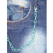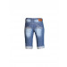 Blue denim pedal pusher with a button and zipper closure at the waist, two patch pockets on the front, two patch pockets at the back, embroidery at the left leg and a blue removable chain at the loops for style