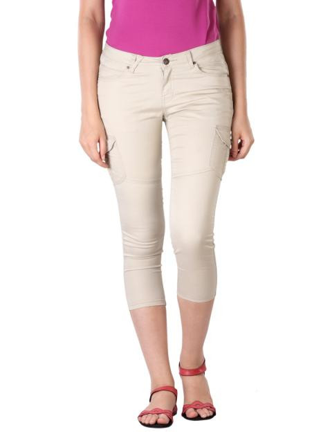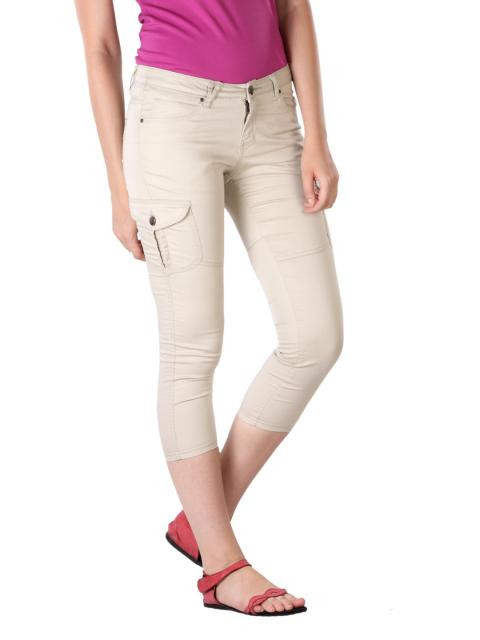 Beige capris with loops at the waist band, button and zipper closure on the front, two pockets on the sides and two at the back and two flap pockets at the knee region