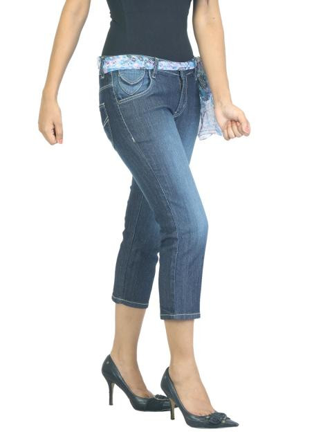 Blue denim shorts made of 72% cotton, 26.5% polyester and 1.5% spandex, above knee length, has fading on thighs and back, a zip and button closure, belt loops on waistband, two front pockets with one change pocket, two patch pockets on back with embroidery and distressed detailing and a silver brand patch on back waistband