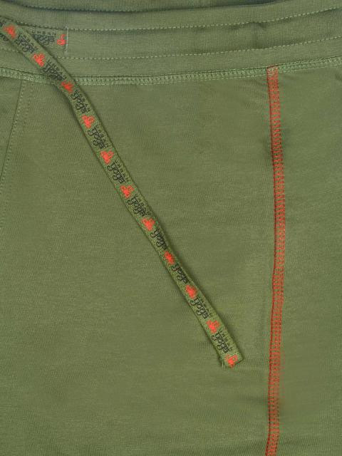 This pair of moss green capris from urban yoga is an essential garment in a woman's wardrobe. Specially designed with spandex for easy movement, the cotton fabric keeps you dry, comfortable and fresh. Any hard seam like zippers or buttons have been carefully avoided for a comfort feel. The stitch detailing in a contrast colour adds a stylish touch, while the drawstrings with urban yoga branding all over them can either be showed off as a bow or tucked in to alter between a funky and prim look. The brand tag has been printed and consciously not stitched so that nothing comes between you and comfort. You can couple this comfort fit capirs with stylish tops - a slim fit one for exercise regimes or a loose fit one for casual occasions.