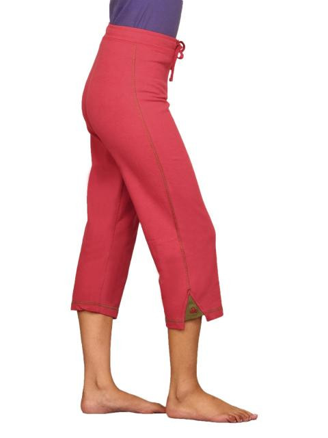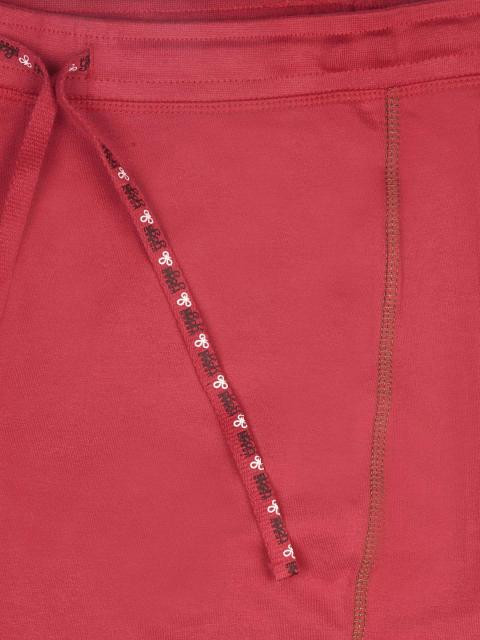 This pair of red capris from urban yoga is an essential garment in a woman's wardrobe. Specially designed with spandex for easy movement, the cotton fabric keeps you dry, comfortable and fresh. Any hard seam like zippers or buttons have been carefully avoided for a comfort feel. The stitch detailing in contrast green adds a stylish touch, while the drawstrings with urban yoga branding all over them can either be showed off as a bow or tucked in to alter between a funky and prim look. The brand tag has been printed and consciously not stitched so that nothing comes between you and comfort. You can couple this comfort fit capirs with stylish tops - a slim fit one for exercise regimes or a loose fit one for casual occasions.