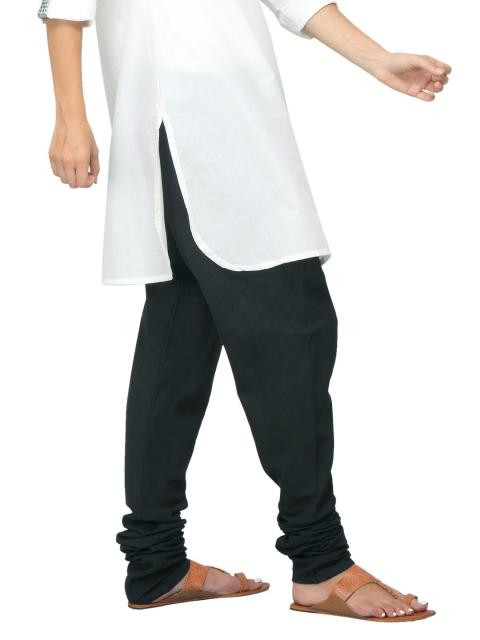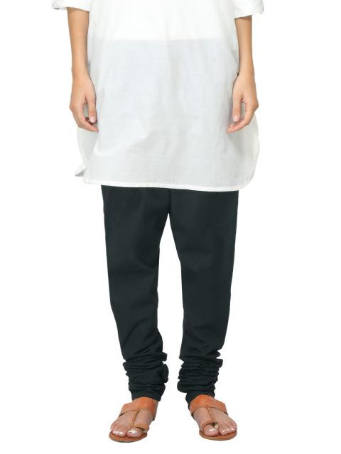 Black mangalgiri churidar made of a cotton fabric, has a waistband with drawstrings and tapered legs