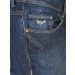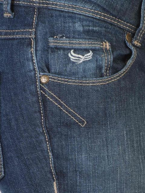 Blue women lowrise slim washed denim made of 98.4% cotton and 1.6% spandex, that has two insert pockets on the front , embroidered brand logo above the left front pocket, two patch pockets on the back with metallic embroidered detailing, styled brand name patch appliqued on the waistband, comfortable looped waistband , metal zipper and two buttons with crystal-like stone closure on the front.  Â