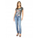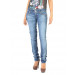 Blue washed denim trousers made of 98.% cotton and 2% spandex, has two insert pockets on the front with embroidered brand logo above the right front pocket, two patch pockets on the back with stitch detailing, brand name appliqued on the looped waistband, metal zipper and two buttons with a crystal embellishment closure on the front.  Â
