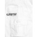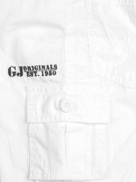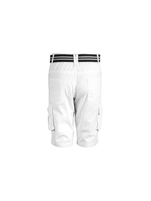 White shorts made of 100% cotton, has two pockets on the sides, two buttoned flap pockets on the front legs, two patch pockets on the back, a fabric belt in black and grey, wide waistband elasticated on the back, removable elastic, and has a button and zipper closure in the front