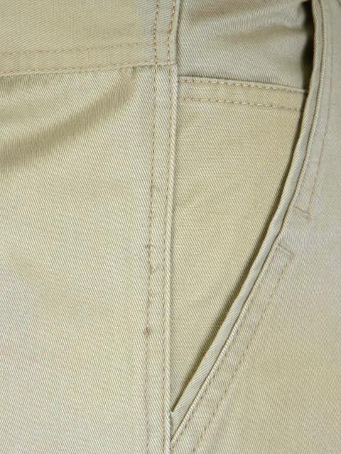 Beige trousers made of 100% cotton, has two pockets on the sides with two patch pockets at the back with an additional small pocket inside that has asymmetric openings, belt loops at waist, a zip and button closure