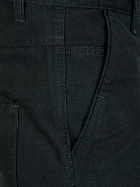 Black trousers made of 100% cotton, has two pockets on the sides with two patch pockets at the back with an additional small pocket inside that has asymmetric openings, belt loops at waist, a zip and button closure