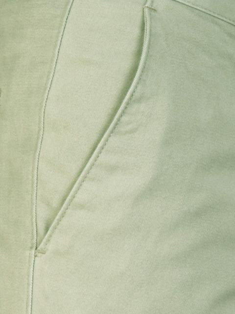 Khaki trousers made of 100% cotton, has a flat front, two pockets at the waist, two pockets at the back with button closures, looped waist, and a button and zipper closure on the front