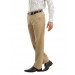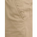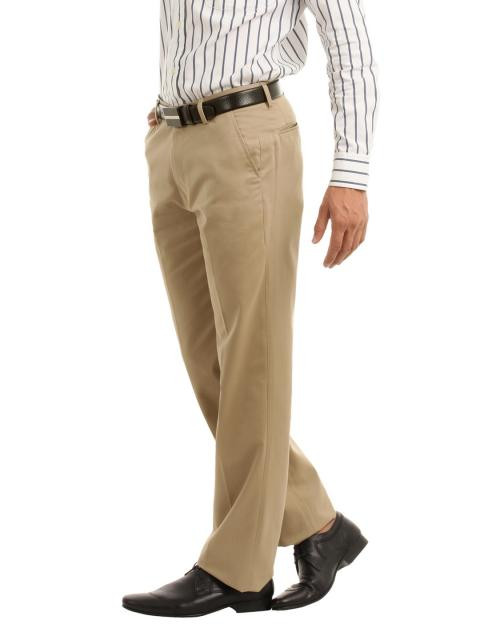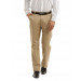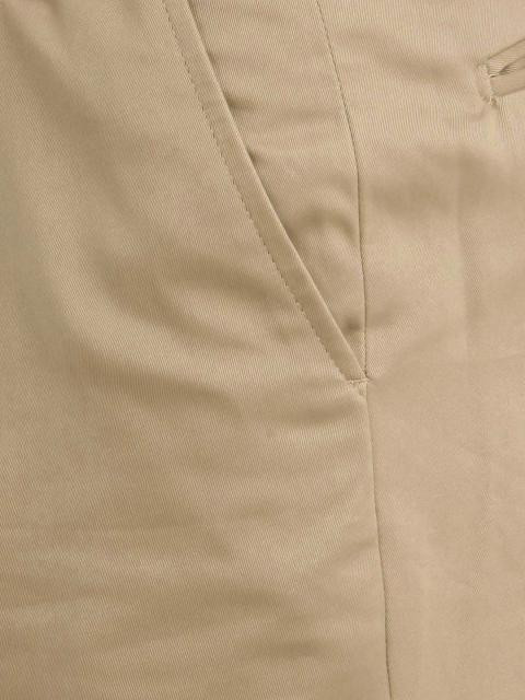 Beige trousers that have a flat front, comfortable waistband with loops, two insert pockets on either sides, two double welt pockets with buttoned closures at the back, brand badge above the back pocket on the right with a buttoned and zipped closure on the front