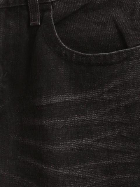 Washed black jeans with a creased look, has a buttoned and zipped closure, belt loops around the waist, brand patch on the waistband at the back, two insert pockets in front with a zippered insert pocket above the right insert pocket and two patch pockets at the back with stitched detail and branding embroidered on the right patch pocket