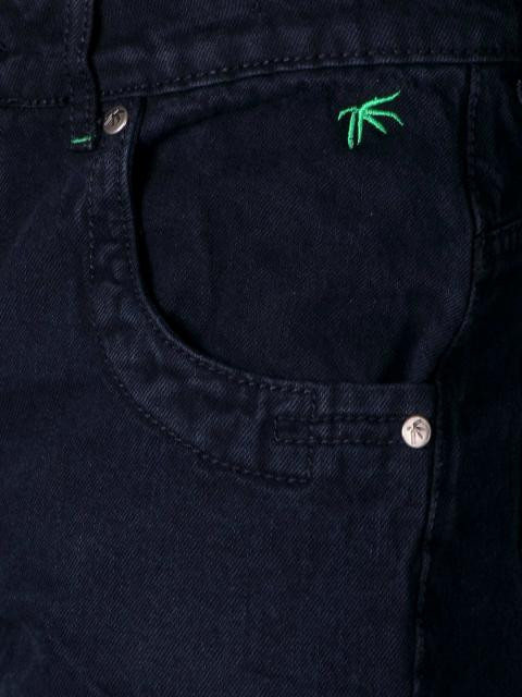 Black denim jeans made of 100% cotton fabric, has two insert pockets on the front with a coinpocket on the right side, two patch pockets at the back with embroidered decoration, elasticated tabs at inner waist to adjust Fit, belt loops and metal zipper and button closure