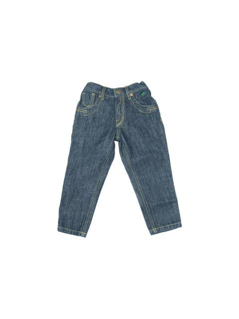 Blue denim jeans made of 100% cotton fabric, has two insert pockets on the front with a patch pocket on the right side, two patch pockets at the back, elasticated waist with belt loops and metal zipper and button closure