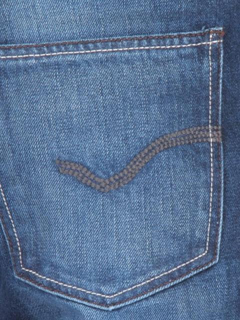 Distressed navy blue denim jeans, that has a straight leg, mock crease details, brown and beige stitch detailing along the pockets, zip fly and five pocket set