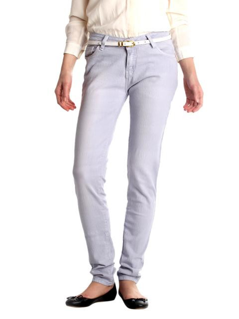 Washed lavender coloured jeans made of 80% cotton, 18.5% polyester and 1.5% spandex, has two insert pockets on the front with one change pocket, two patch pockets on the back with thread detailing, brand patch appliqué d on the waistband at the back and a zipper and button closure