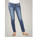 Blue denim pants made of 78% cotton, 19% polyester and 3% spandex, with a zippered and buttoned waist, loops on waist for a belt with a brand badge in silver appliqued on the right at the back, zippered at the ankle, and has two side pockets in the front with a small pouch on the right pocket and two back pockets with embroidery